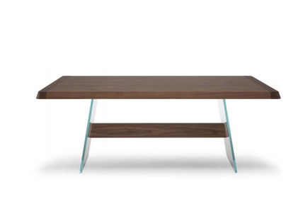 A grandeza da madeira e a leveza da base de vidro tornam o design desta mesa único e altamente distinto.